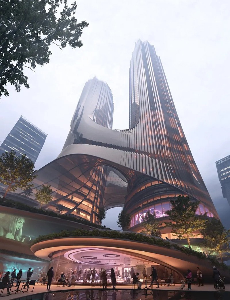 C塔被稱為“未來之塔”,位于深圳市南山區深圳灣超級總部基地的“十字雙軸”中心,總投資約165億元,占地面積3.6萬平方米,由高約395米和300米的兩座摩天樓共同組成的一座多維度“垂直都市”,呈“雙人起舞”的形體。