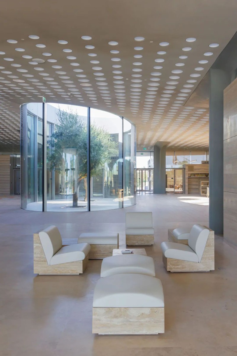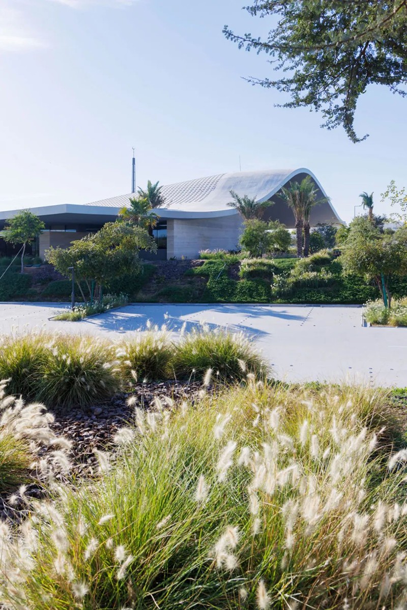 建筑的波浪形屋頂象征女性持續(xù)向上、自我成長(zhǎng)的力量。兩棵橄欖樹穿過屋頂結(jié)構(gòu)、向天而立,寓意和平與生命的延續(xù)。室內(nèi)外空間通過庭院與花園過渡連接,強(qiáng)化了人與自然的精神交匯,為來訪者提供安靜冥想與社區(qū)互動(dòng)的可能。