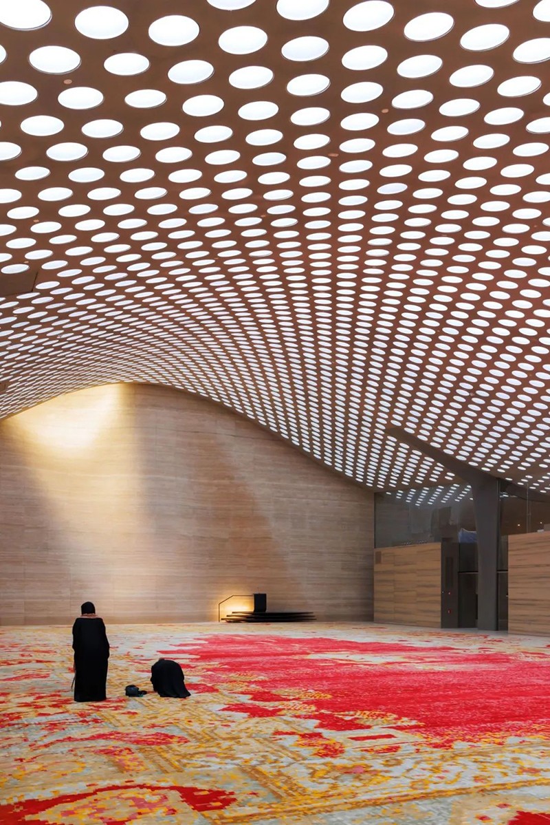 項(xiàng)目的核心為空間是一個(gè)面積875平方米的祈禱大廳,略微偏離建筑網(wǎng)格17度,準(zhǔn)確朝向麥加。廳內(nèi)鋪設(shè)有由新西蘭羊毛制成的大型手工簇絨地毯,其圖案以集體尺度重釋了傳統(tǒng)伊斯蘭幾何紋樣。天花布置了5,500個(gè)錐形天窗,將自然光引入室內(nèi),營(yíng)造出神圣靜謐的光環(huán)境。